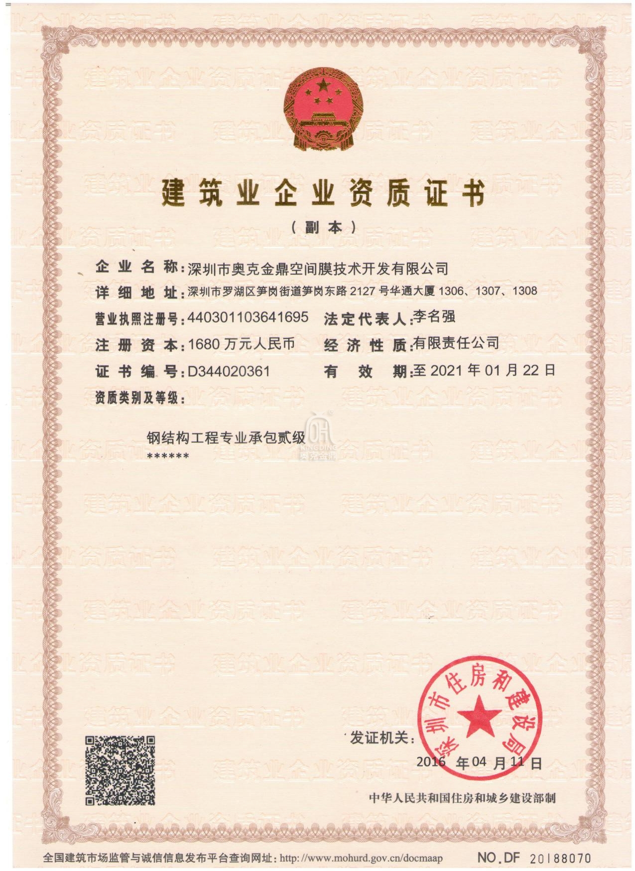 鋼結構工程安裝貳級,膜結構工程設計壹級,膜結構工程施工壹級,具備安全生產許可證。